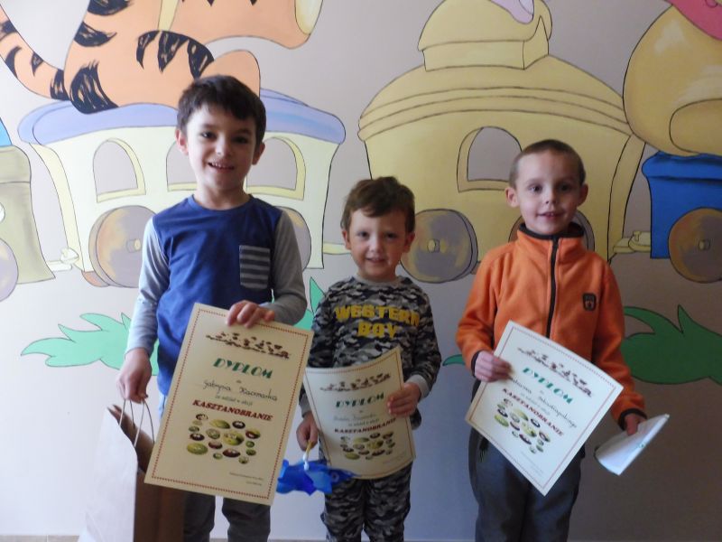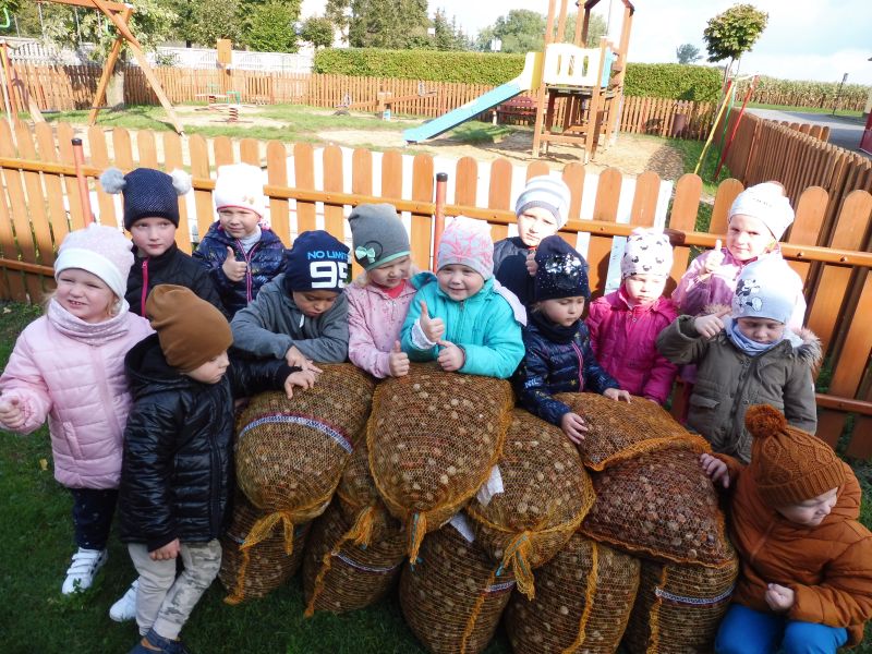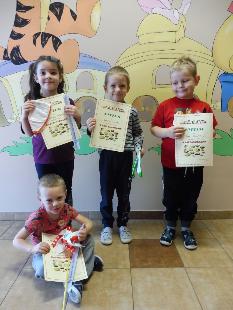 Nasze przedszkolaki po raz kolejny uczestniczyły w akcji „Kasztanobranie”. Dzieci wraz z całymi rodzinami czynnie włączyli się w zbiórkę kasztanów i przynosili każdą ilość. Za udział w akcji wszystkie dzieci otrzymały dyplomy i drobne upominki a te, które uzbierały najwięcej otrzymały nagrody. Ponad 500 kilogramów zebrali: Nikola Czajka, Michał Sej i Wojtek Piszczelski z grupy Tygryski. Ponad 300 kilogramów - Szymon Wojtkowiak z grupy Tygryski. Ponad 100 kilogramów: Ksawery Kryś i Julka Szulc z Grupy Tygryski oraz Gabriel Kaczmarek, Miłosz Kryś, Kornelia Obecna, Antoni Piotrowski i Jakub Walczak z grupy Misie. W akcji wzięły udział 33 rodziny i zebrały 3144 kilogramów kasztanów, które zostały sprzedane dla zwierząt do lasu oraz jako surowiec do wyrobu lekarstw. Uzyskane środki pozwoliły na zakup zabawek, które sprawiły przedszkolakom dużą radość. Za ogromne zaangażowanie w zbiórkę kasztanów serdecznie dziękujemy dzieciom i ich rodzinom.