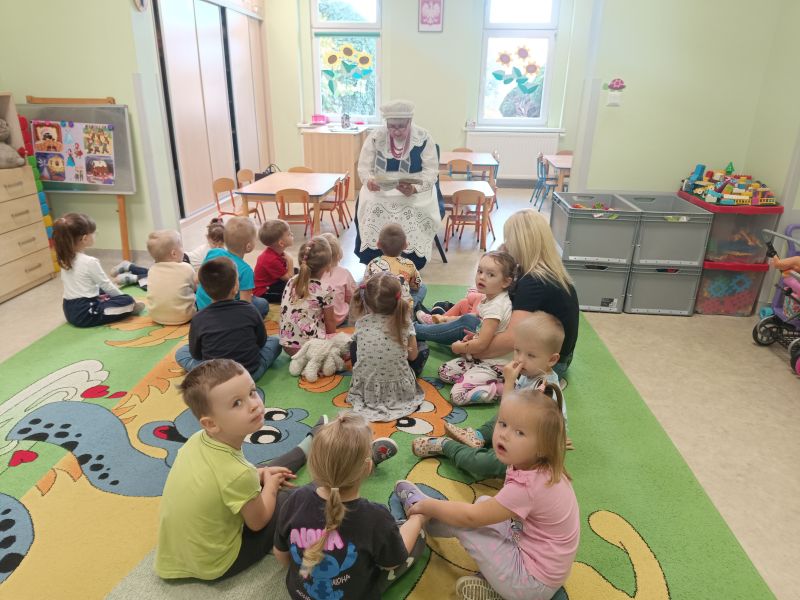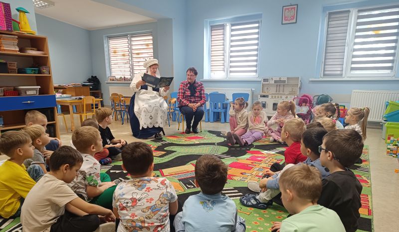 5 listopada 2025 r. odwiedziły nas panie z zespołu Kalina. Pani Barbara Krzekotowska, Halina Wałęsa i Teresa Kaczmarek czytały dzieciom bajki, które zostały zakupione w ramach programu: "Narodowy Program Rozwoju Czytelnictwa". Następnie Panie recytowały wiersze, śpiewały piosenki zapoznając dzieci z gwarą regionu. Przedszkolaki miały też okazję poznać piękne ludowe stroje, które są wizytówką zespołu Kalina. Celem spotkania było połączenie tradycji regionalnych z promocją czytelnictwa. Takie zajęcia edukacyjne są ciekawym doświadczeniem dla dzieci. Nasze przedszkole realizuje zadania programu "Narodowy Program Rozwoju Czytelnictwa 2.0. na lata 2021-2025". Dzięki zdobytym funduszom zakupiono książki za sumę 1700,00 zł.